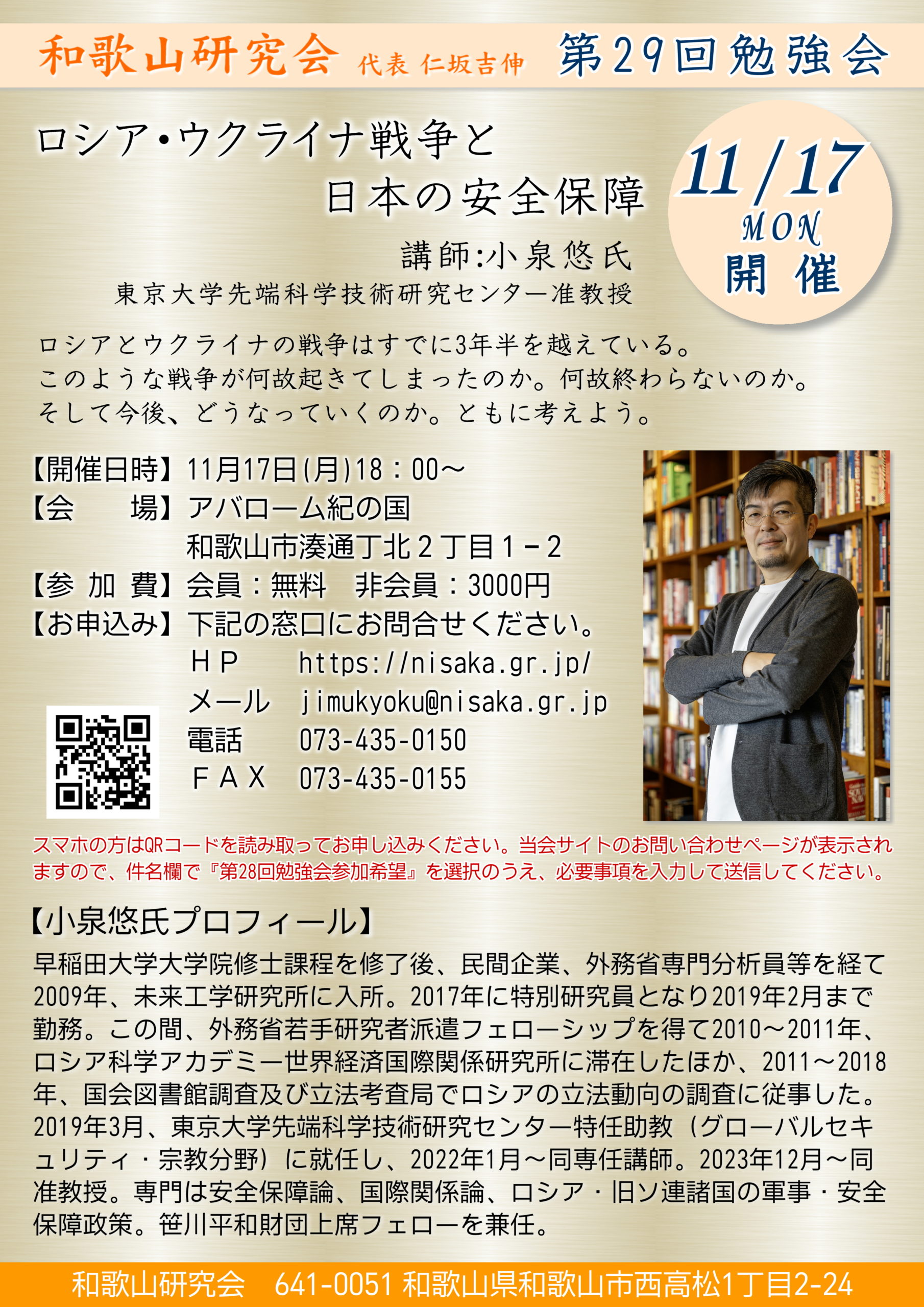 【タイトル】 ロシア・ウクライナ戦争と日本の安全保障 【講師】 小泉悠氏 東京大学先端科学技術研究センター准教授 【日時】 11月17日(月)午後6時~(2時間程度) 【会場】 アバローム紀の国(和歌山市湊通丁北2丁目1−2) 【参加費】 和歌山研究会会員・・・無料 一般・・・3000円
