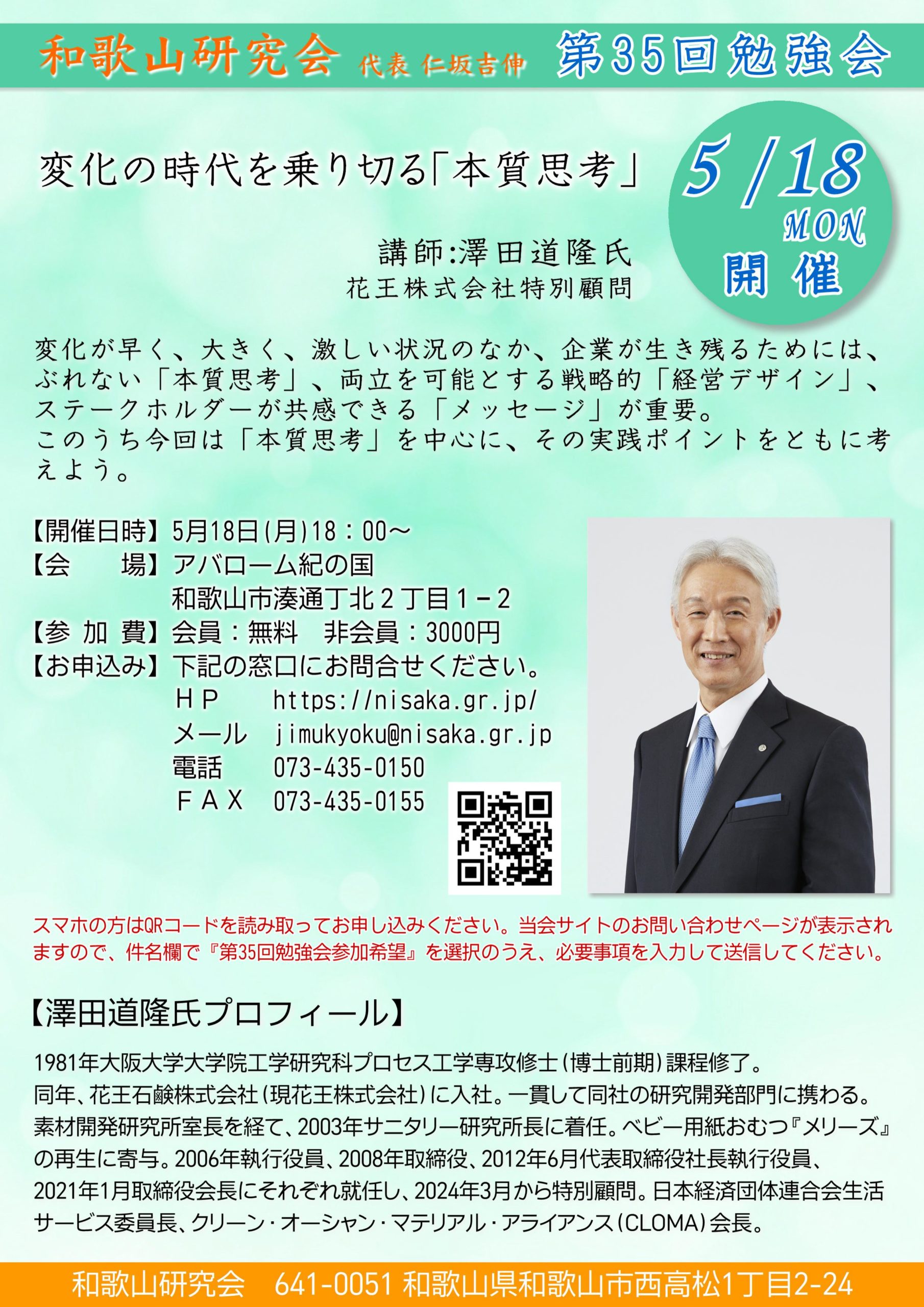 参加ご希望の方は、電話(073-435-0150)かホームページお問い合わせフォーム(件名は『第35回勉強会参加希望』を選択してください)でご連絡ください。